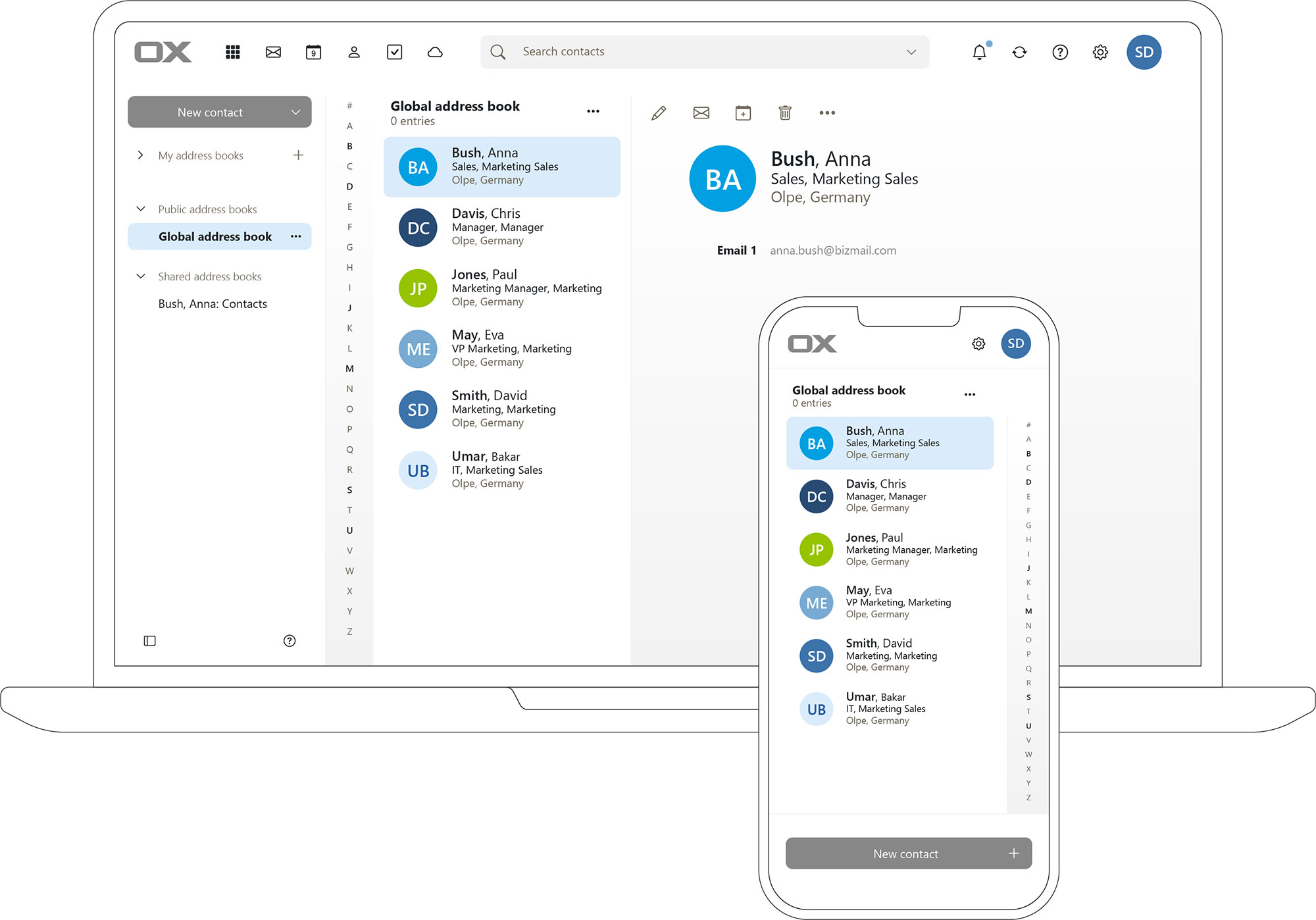 Access OX Address Book from any device – the layout automatically adapts to the screen size